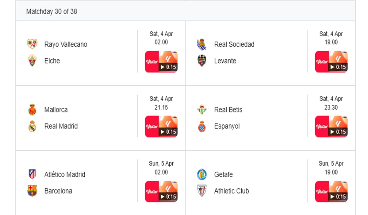 Jadwal Liga Spanyol Pekan 30