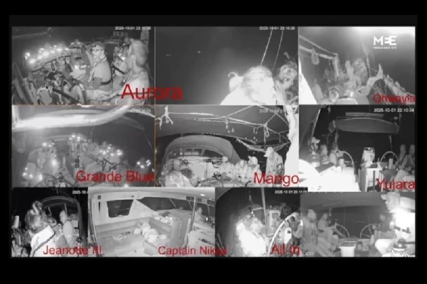 Tayangan dari kapal Armada Global Sumud yang berusaha menerobos pengepungan di Gaza, sebagaimana disiarkan daring oleh Middle East Eye. Foto/mee