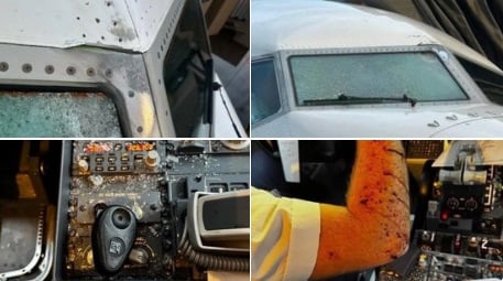 Gambar-gambar yang belum diverifikasi di media sosial menunjukkan kerusakan badan pesawat dan pecahan kaca di kokpit, serta darah di lengan pilot.
